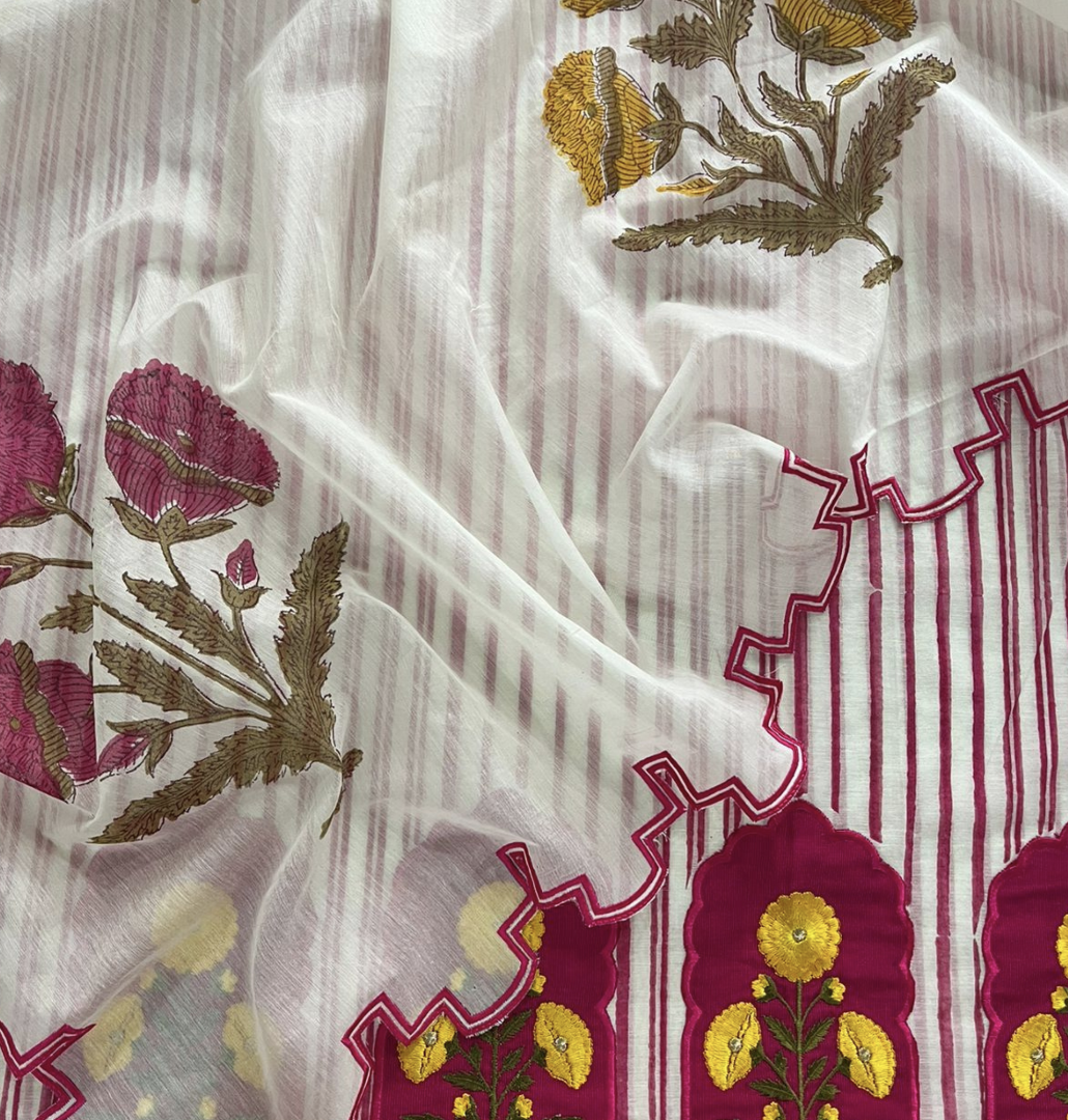 Beautiful Hand Block Printed Pure Chanderi Kurtas, Enhanced With Embroidered Patchwork, Paired With Pure Chanderi Hand Block Printed Scalloped Dupattas & Soft Cotton Matching Lowers