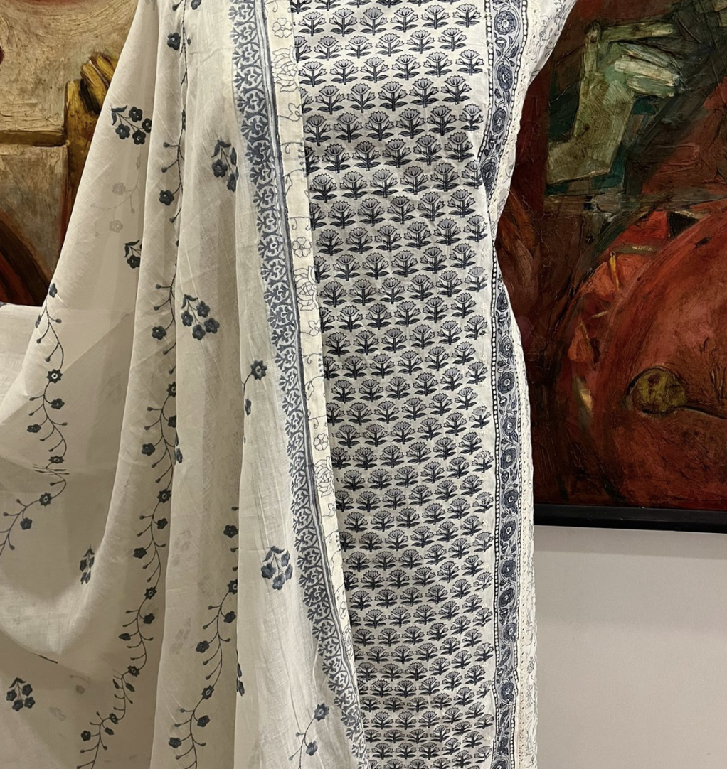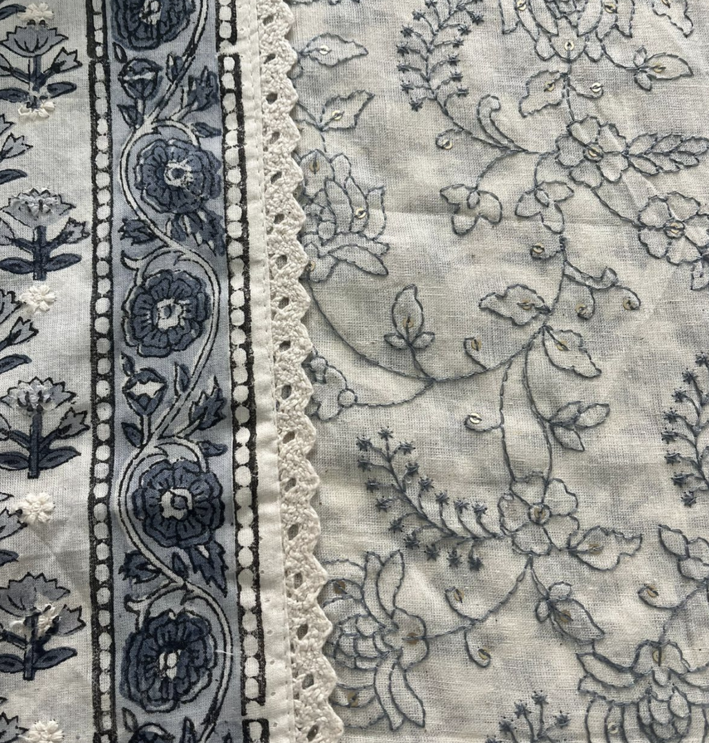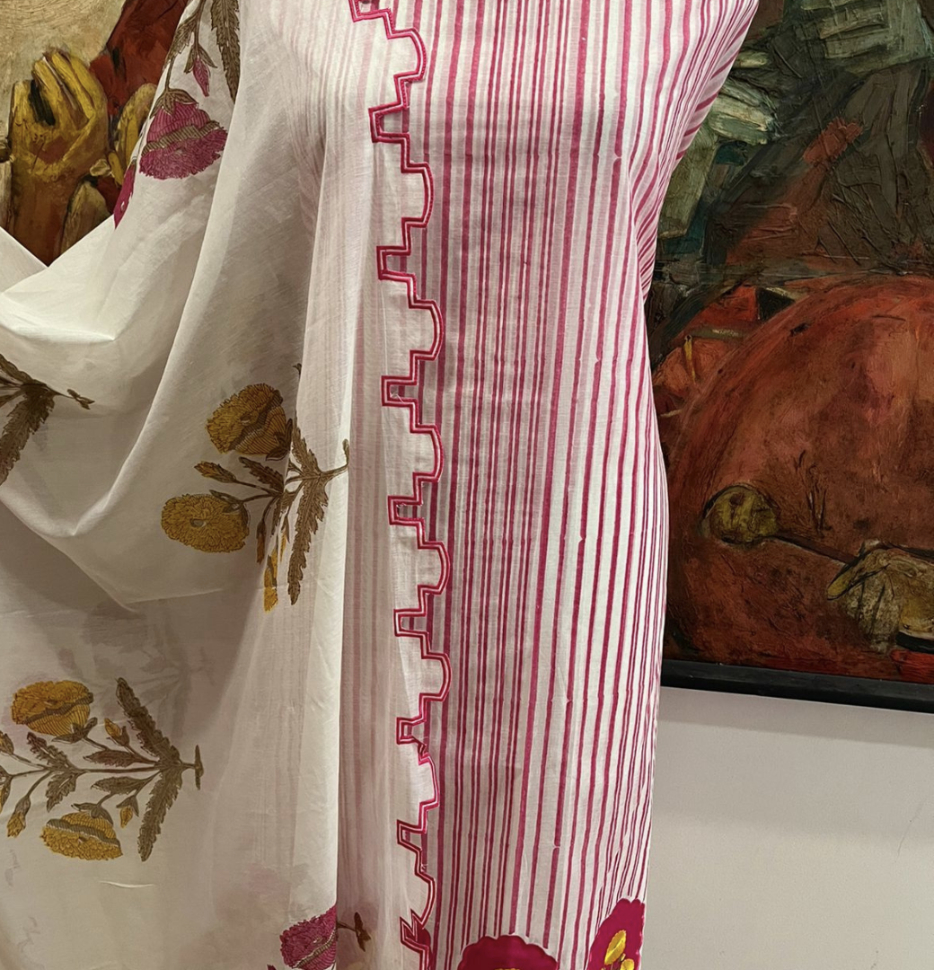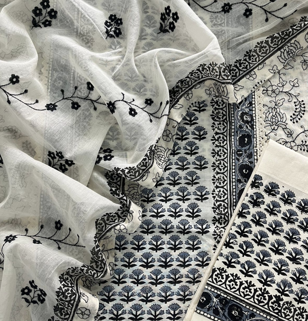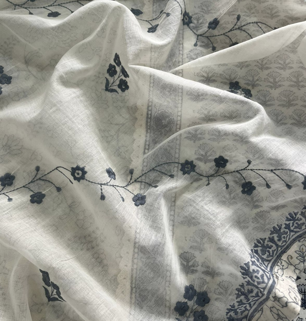Graceful Pure Cotton Hand Block Printed Kurta Having Floral Embroidered Panel, Paired With Mulmul Thread Embroidered Dupattas, Along With Soft Cotton Hand Block Printed Lowers