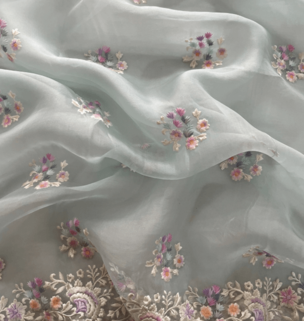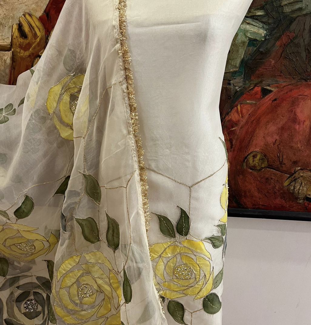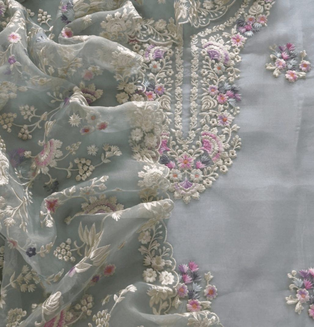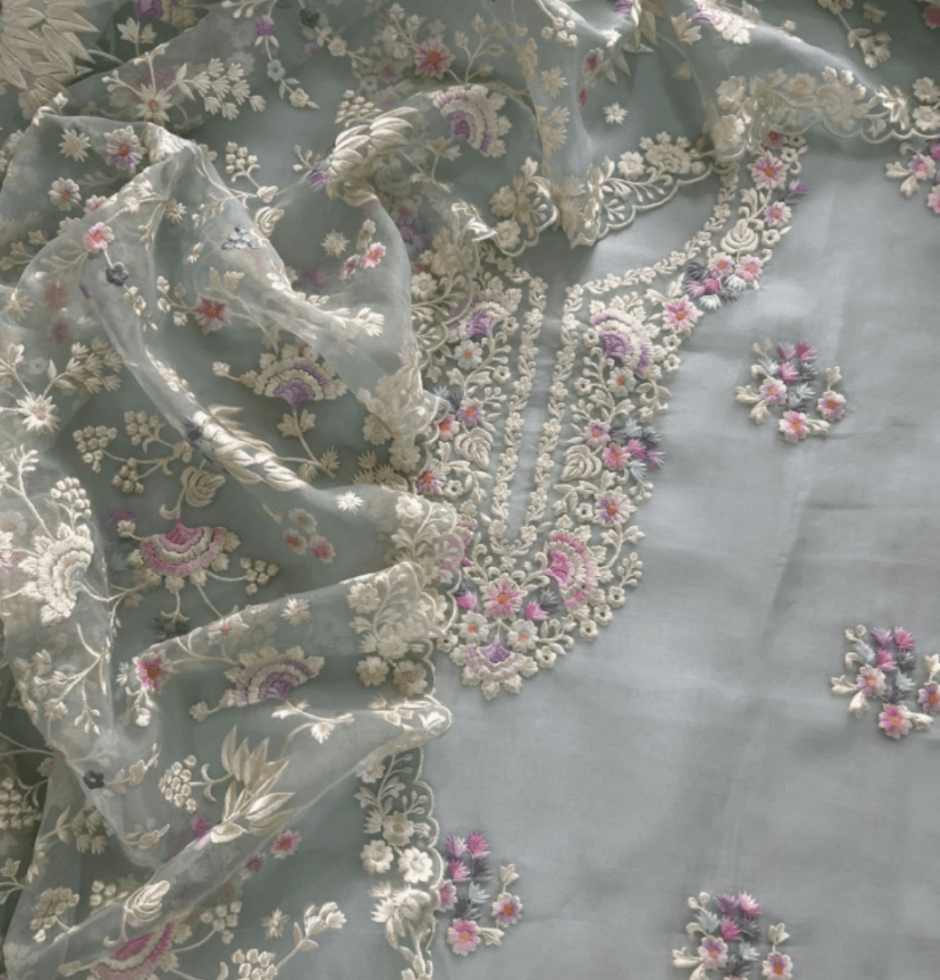 Pure Organza Silk Kurta & Dupatta adorned with intricate 3D Applique work & Parsi Embroidery along with Crepe Lowers