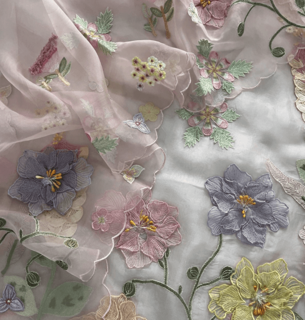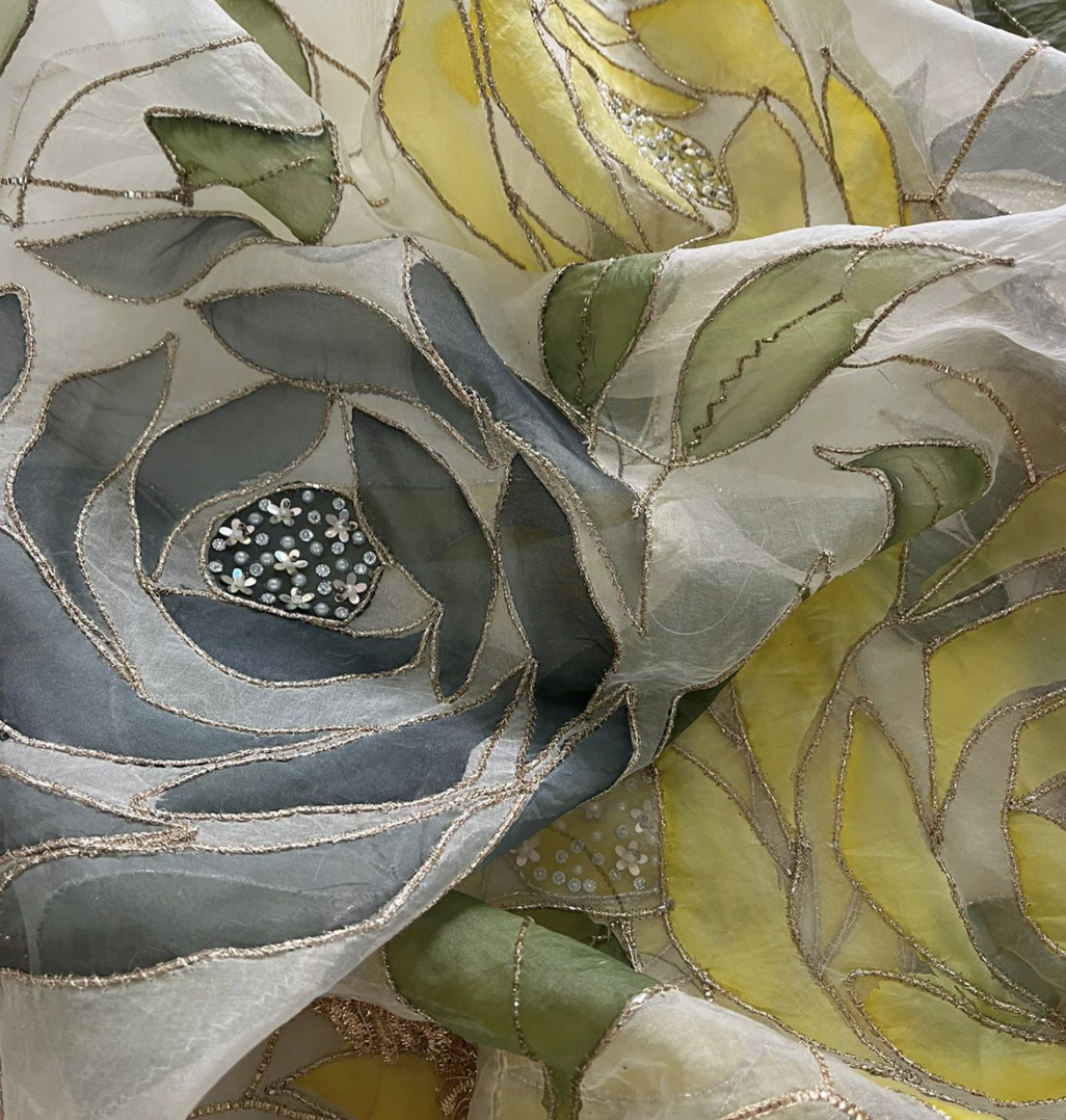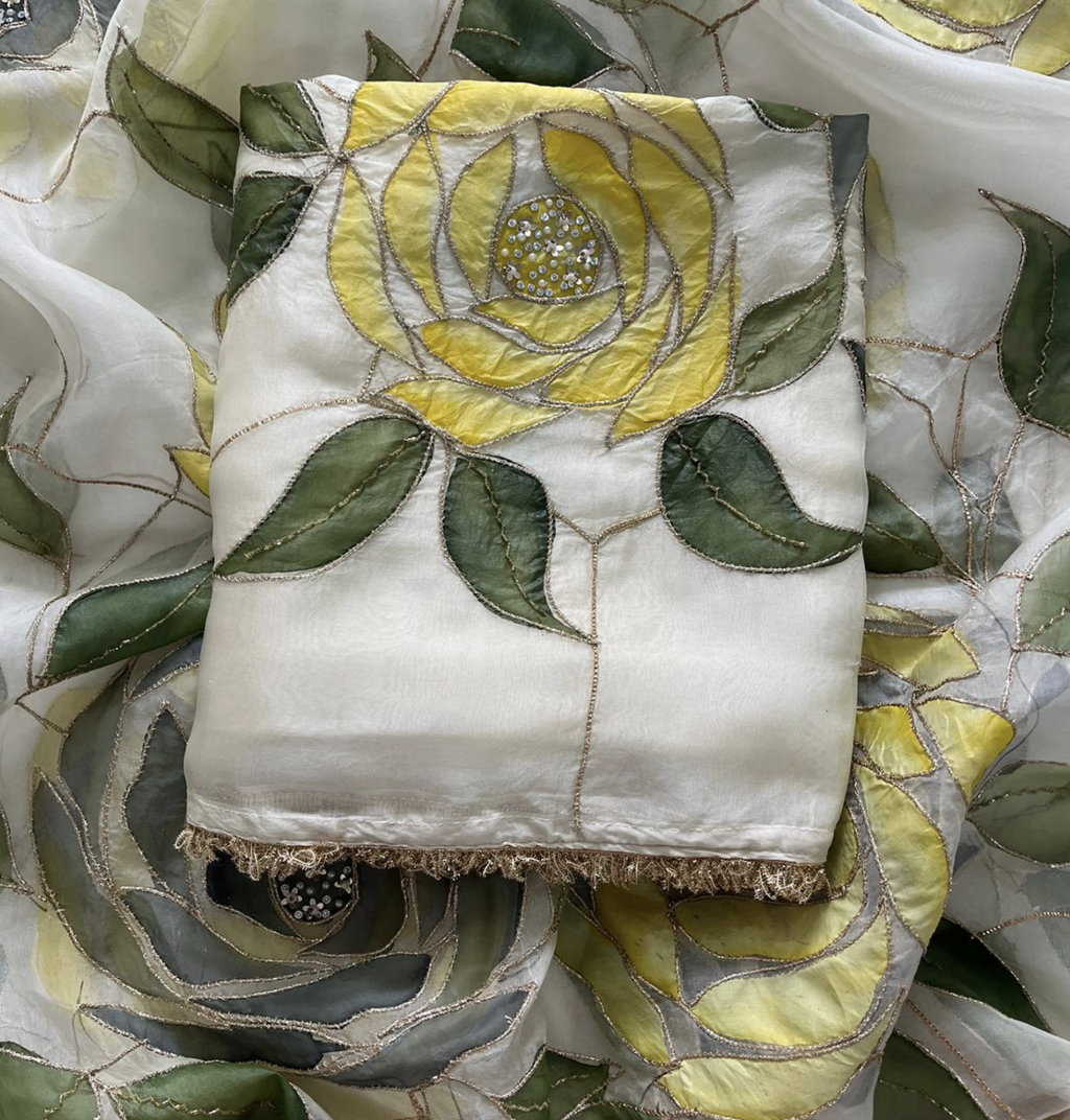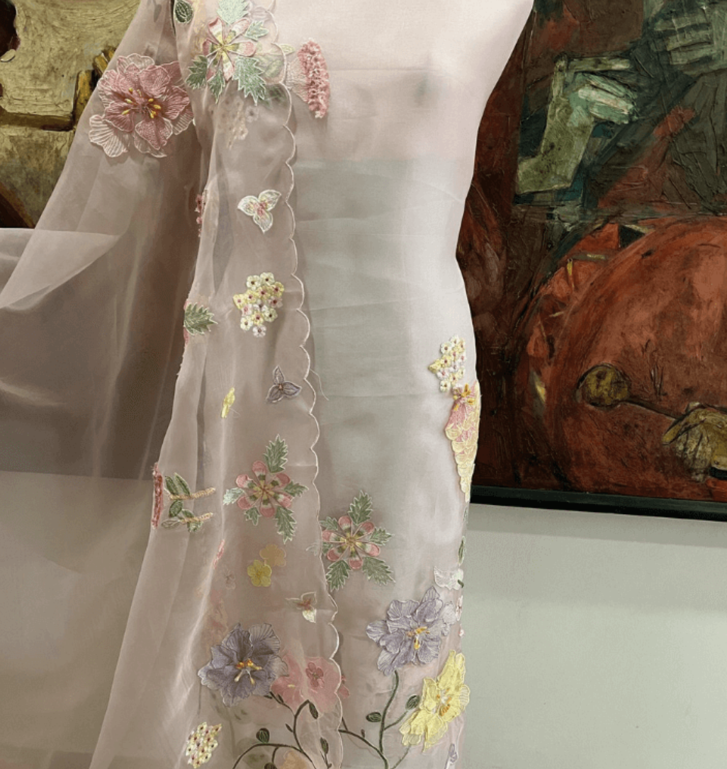 Pure Organza Silk Kurta & Dupatta adorned with intricate 3D Applique work & Parsi Embroidery along with Crepe Lowers