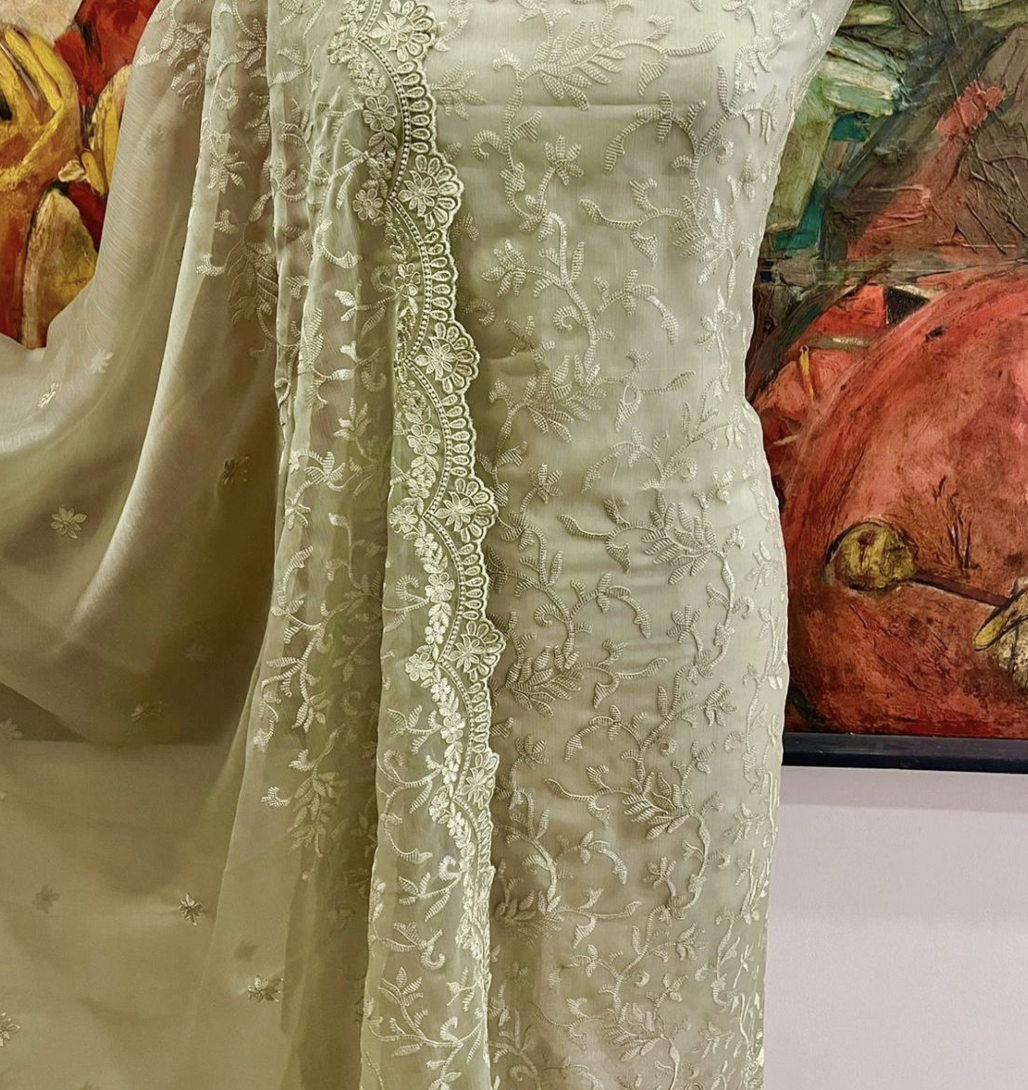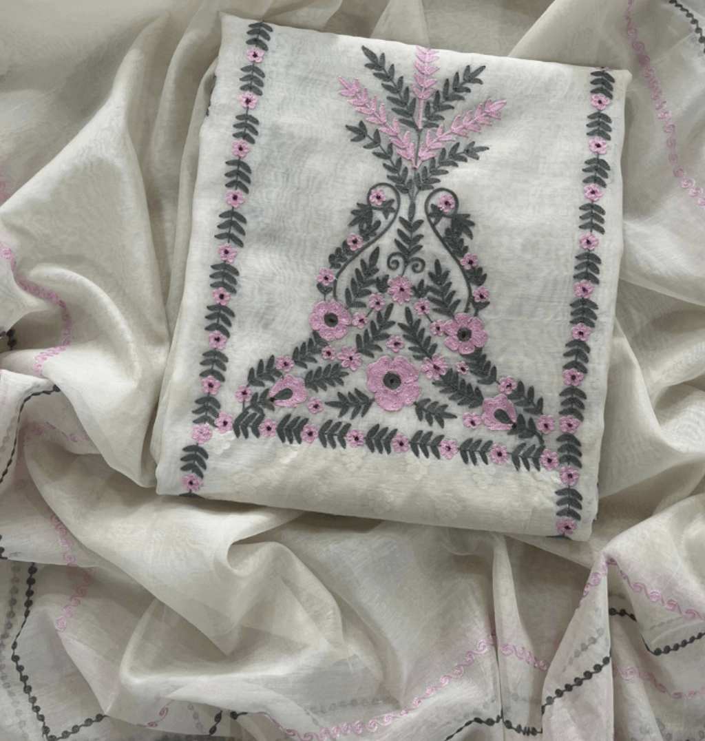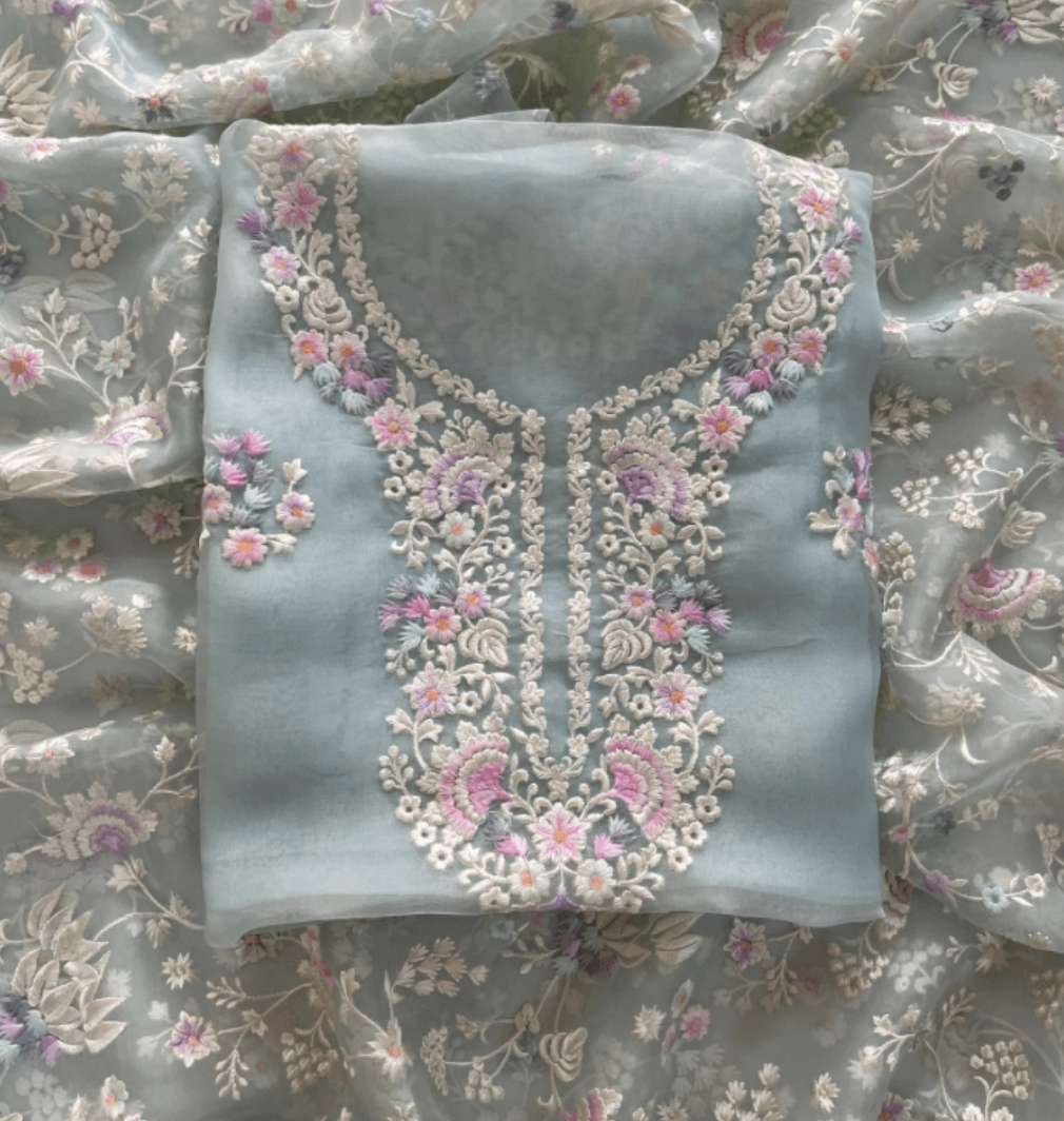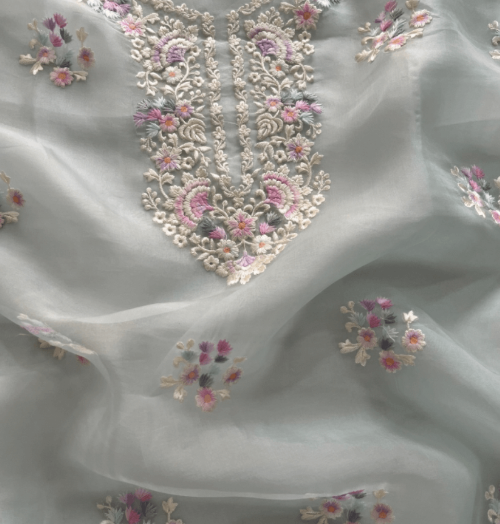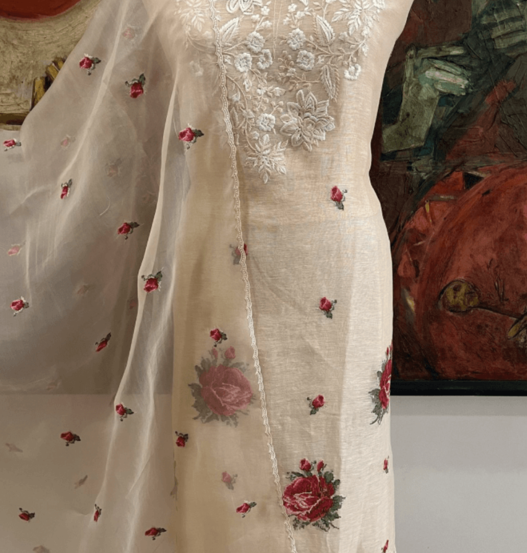 Pure Organza Silk Kurta & Dupatta Having Intricate Parsi Embroidery, Along With Cotton Satin Lowers