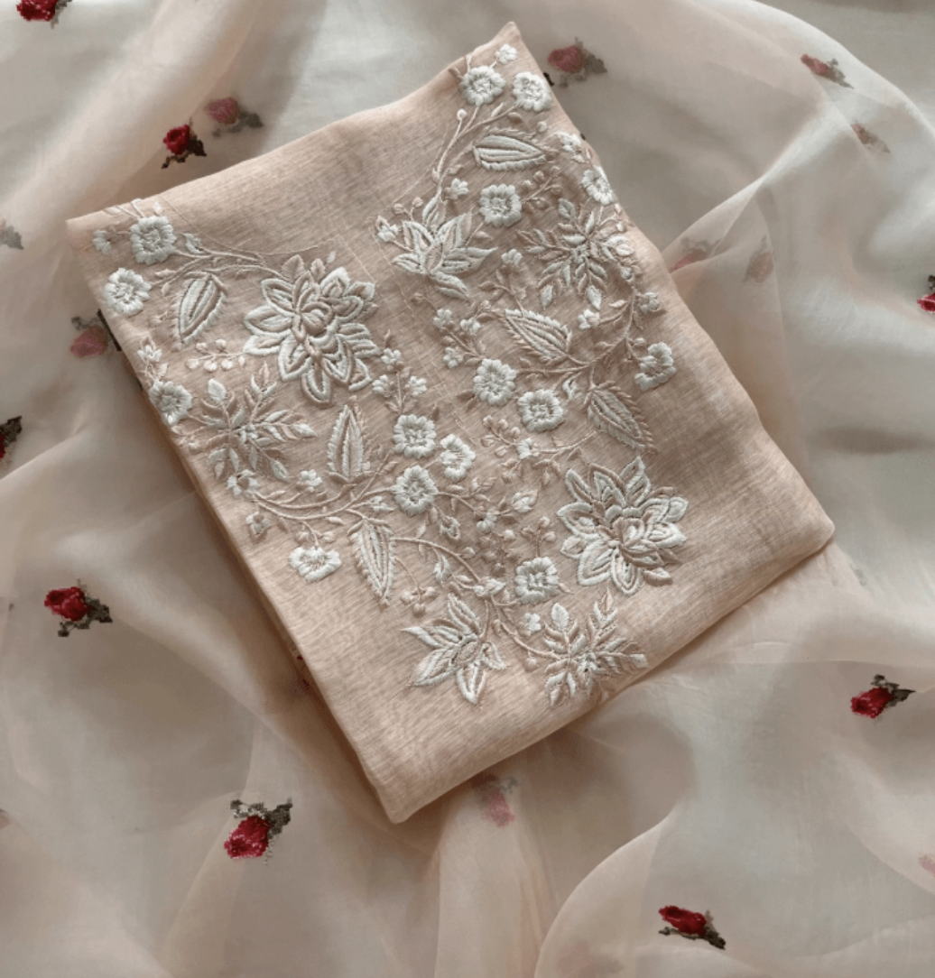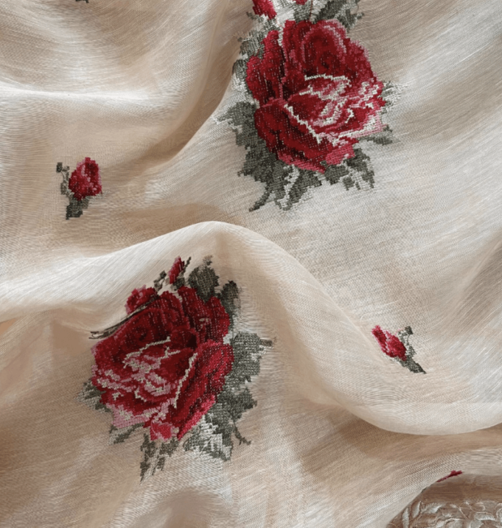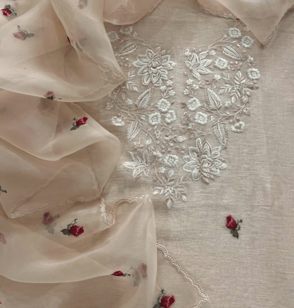 Pure Linen Kurta Having Intricate Parsi & Cross Stitch Embroidery Paired With Organza Cross Stitch Embroidered Dupatta, Along With Cotton Satin Lowers